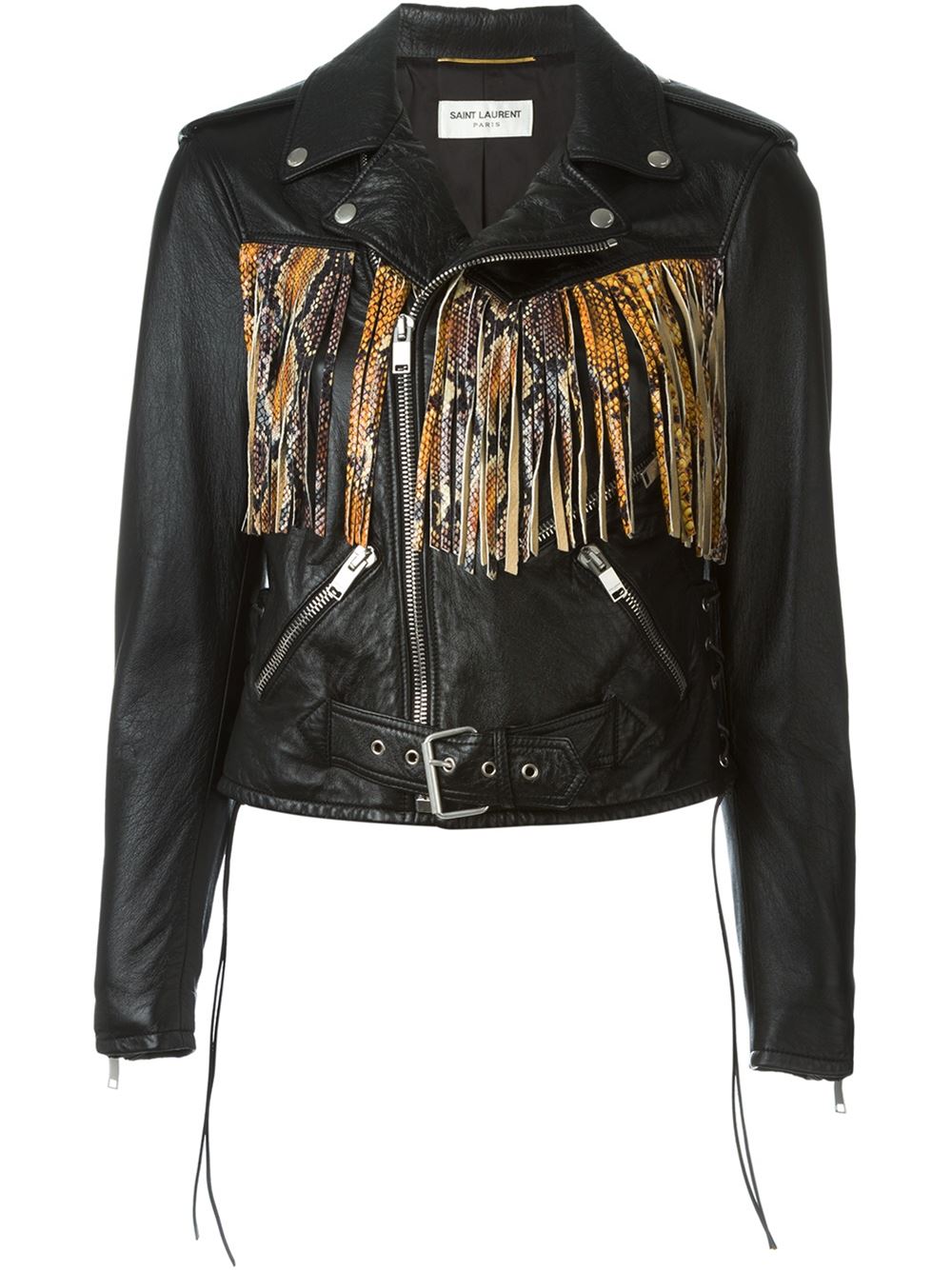 - Saint Laurent 黑色 小羊皮 流苏机车夹克。 偏中心正面拉链, 梯形翻领, 正面拉链口袋, 肩章, 长袖, 拉链袖口, 扣子, 平直下摆。请注意,这件商品不能寄到欧盟以外。