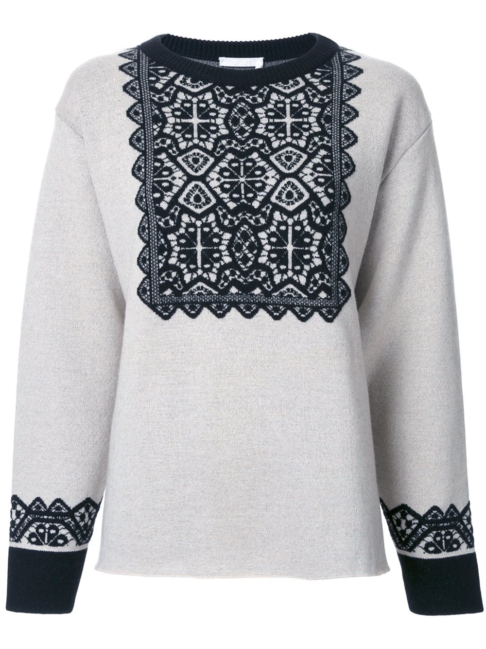 - Chloé (寇依) 黑色与灰色 羊毛 提花毛衣。 罗纹针织圆领, 嵌花针织, 长袖, 不折边下摆。