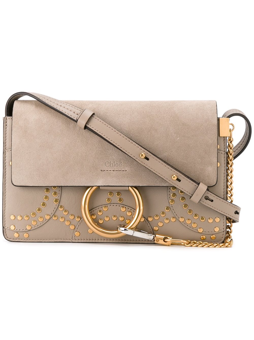 - Chloé (寇依) 灰色 小牛皮与小牛绒面皮 'Faye'小号单肩包。 翻盖饰有插入式的摁扣, 对比滚边, 金色铆钉, 圆点花纹, 正面饰有浮雕品牌标记, 金色五金配件, 可调肩带, 口袋, 内置浮雕标记。