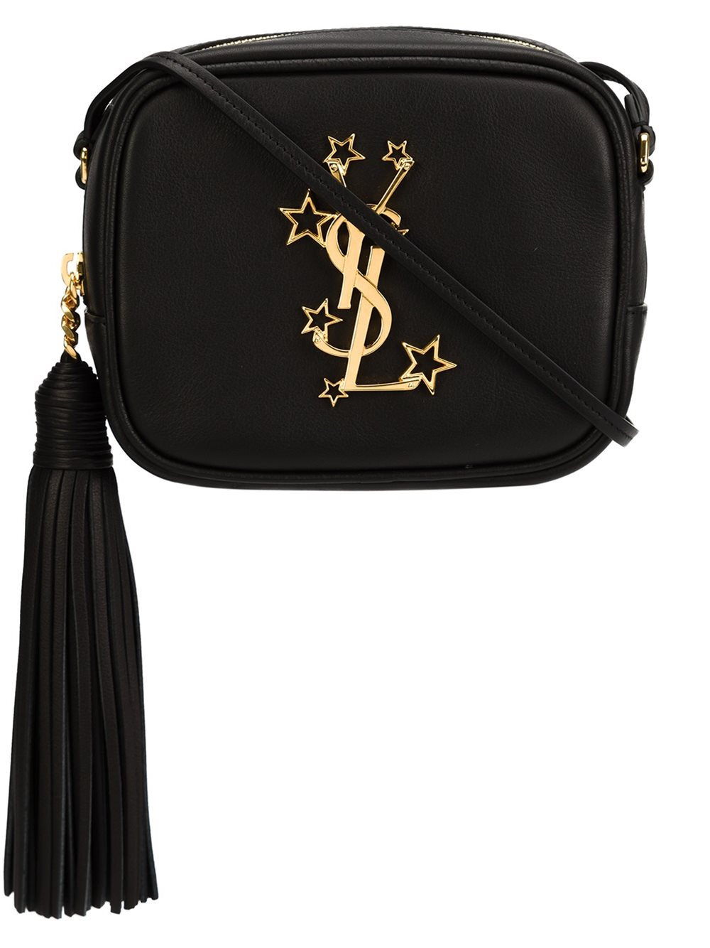 - Saint Laurent (圣罗兰) 黑色 牛皮 'Monogram Blogger'单肩包。 金色标牌, 流苏挂饰, 肩带, 拉链。