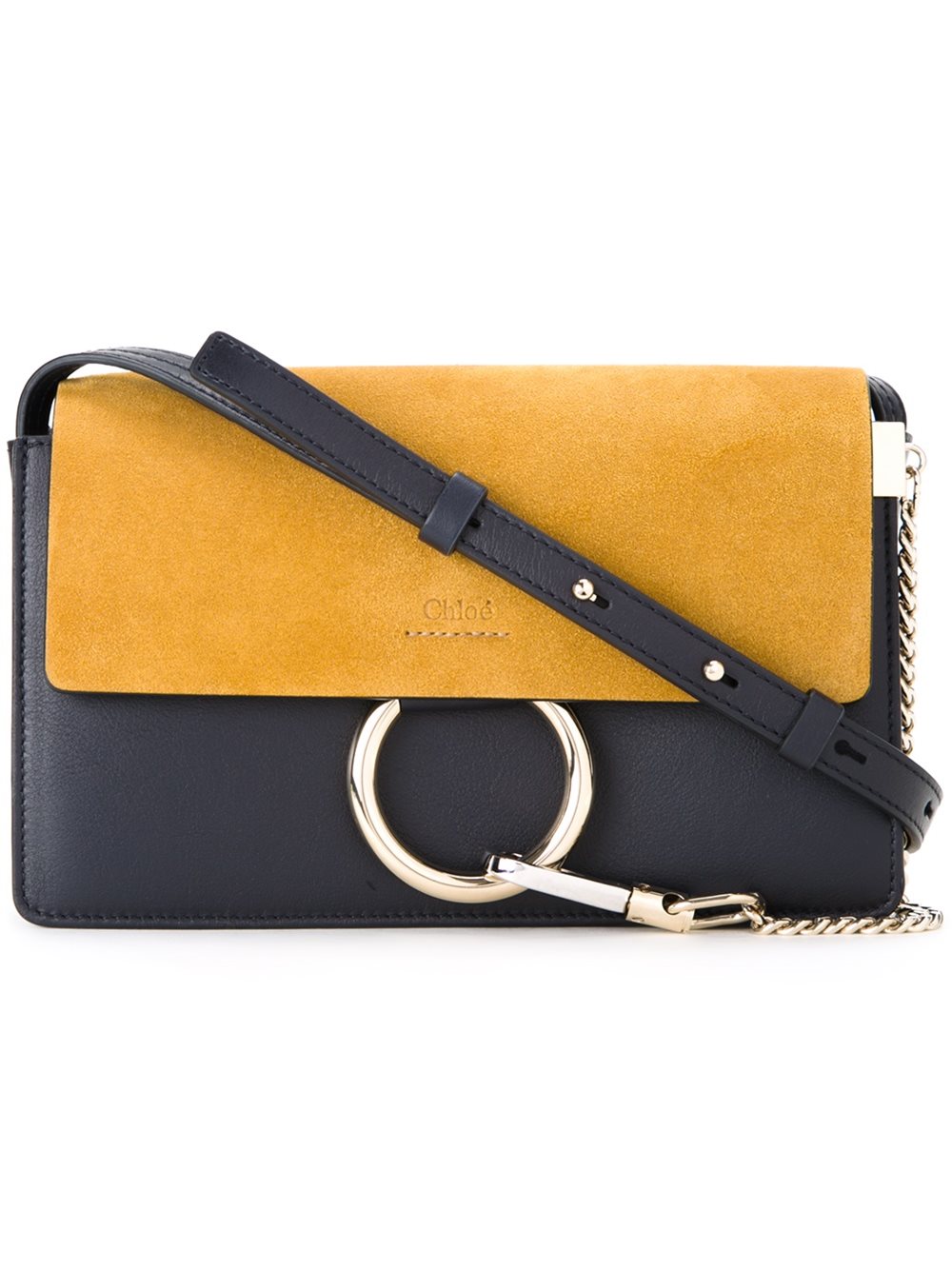 - Chloé (寇依) 蓝色与黄色 绒面皮与牛皮 'Faye'小号肩背包。 翻盖饰有插入式的摁扣, 双色设计, 金色五金配件, 正面饰有浮雕品牌标记, 可调肩带, 口袋, 内置浮雕标记, 内置一个可延展的夹层。