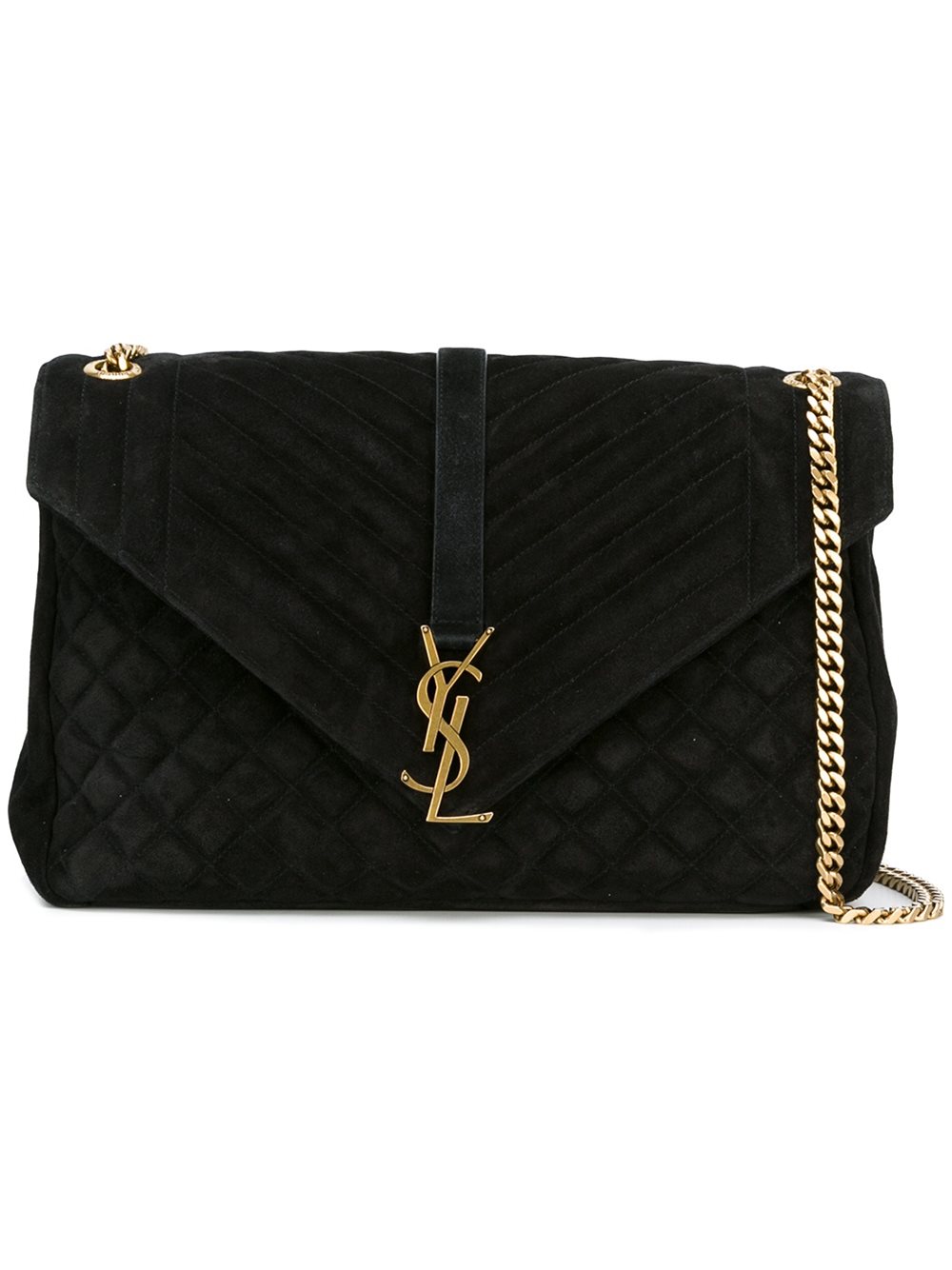 - Saint Laurent (圣罗兰) 黑色 小牛绒面皮 'Monogram'大号斜挎包。 皮革边饰链式肩带, 金色五金配件, 正面标志贴, 信封式, 翻盖饰有插入式的摁扣, 后置贴袋, 内置拉链夹层, 内置贴袋, 内置标牌。