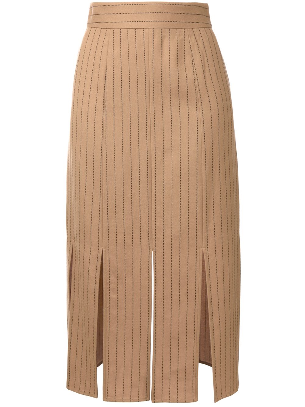 - Le Ciel Bleu 驼色 羊毛 细条纹开衩半身裙。