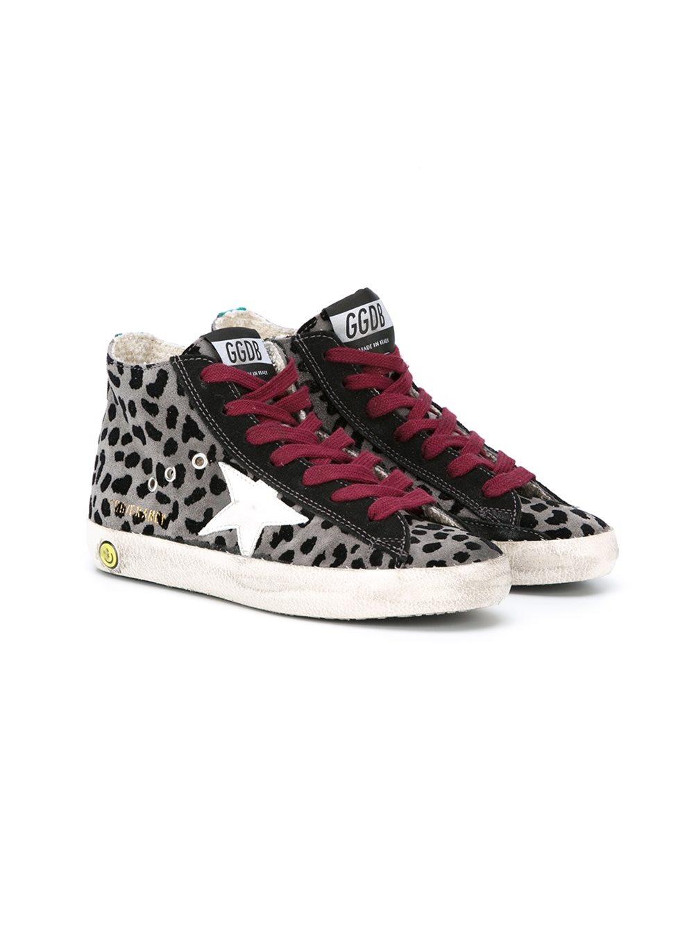 - Browse relaxed footwear styles inspired by pop culture and contemporary art. These multicoloured leather, patent leather and suede 'Francy' hi-top sneakers from Golden Goose Deluxe Brands Kids feature an almond toe, an animal print, distressed effects, a logo patch at the tongue, a lace-up front fastening, a side zip fastening, a flat rubber sole and a signature star patch at the side. This item is unisex.
