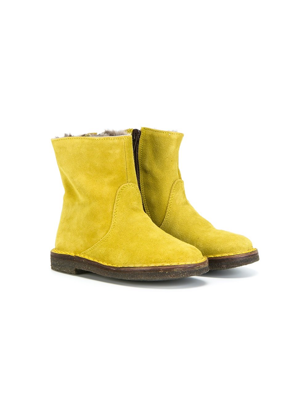 - Pèpè 黄色 小牛绒面皮 毛皮边饰短靴。 圆头, 侧置拉链, 缝合拼接设计, 橡胶鞋底。