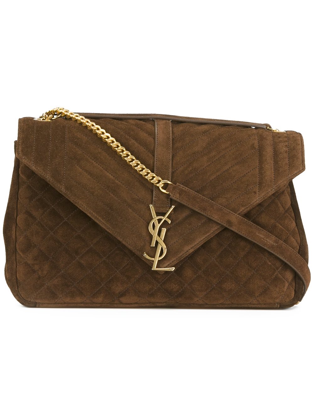 - Saint Laurent (圣罗兰) 咖啡色 绒面皮 'Monogram'中号肩背包。 皮革边饰链式肩带, 金色五金配件, 信封式, 翻盖饰有插入式的摁扣, 全衬里, 内置拉链夹层, 内置贴袋, 内置标牌。