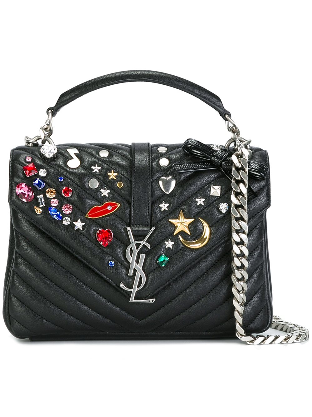 - Saint Laurent (圣罗兰) 黑色 羊皮 'College'斜挎包。 顶部饰有扁平手柄, 皮革边饰链式肩带, 银色五金配件, 后置贴袋, 信封式, 蝴蝶结细节, 水晶镶嵌, 内置标签, 内置拉链夹层, 全衬里。