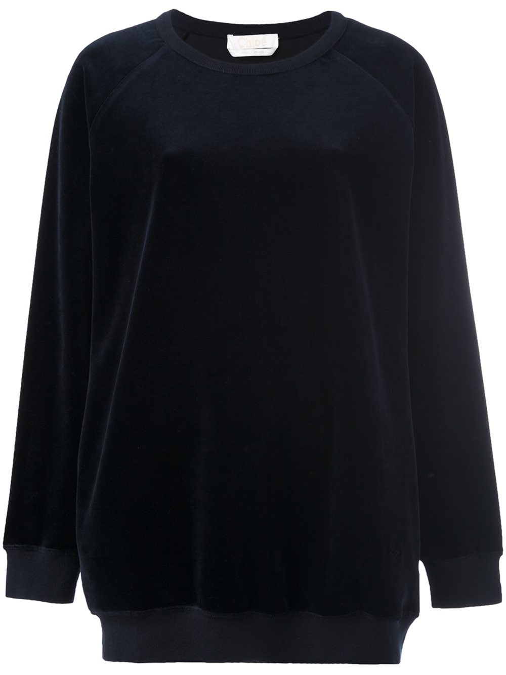 - Navy cotton blend velvet jumper from Chloé featuring a round neck, ribbed trimming, long sleeves and a straight hem.