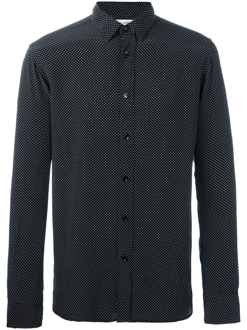 - Saint Laurent (圣罗兰) 黑色与白色 丝绸 波点印花衬衫。 经典衣领, 正面纽扣, 圆点印花, 长袖, 搭扣袖口, 曲线形底边。