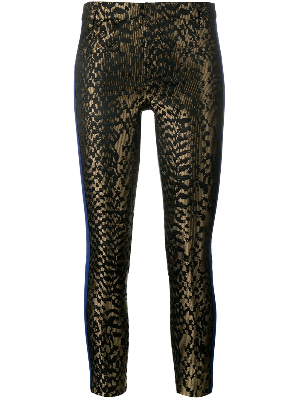 - Haider Ackermann 黑色与金色 丝绸棉质混纺牛皮 正面动物纹长裤。 系腰带袢腰边, 隐藏式正面开合, 侧置口袋, 后置平袋, 对比滚边, 超窄腿, 短款。