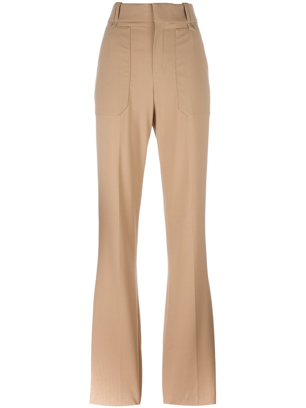 - Chloé (寇依) 驼色 初剪羊毛混纺与真丝 合身喇叭裤。 系腰带袢腰边, 隐藏式正面开合, 正面饰有凸起缝线, 侧身口袋, 长款。