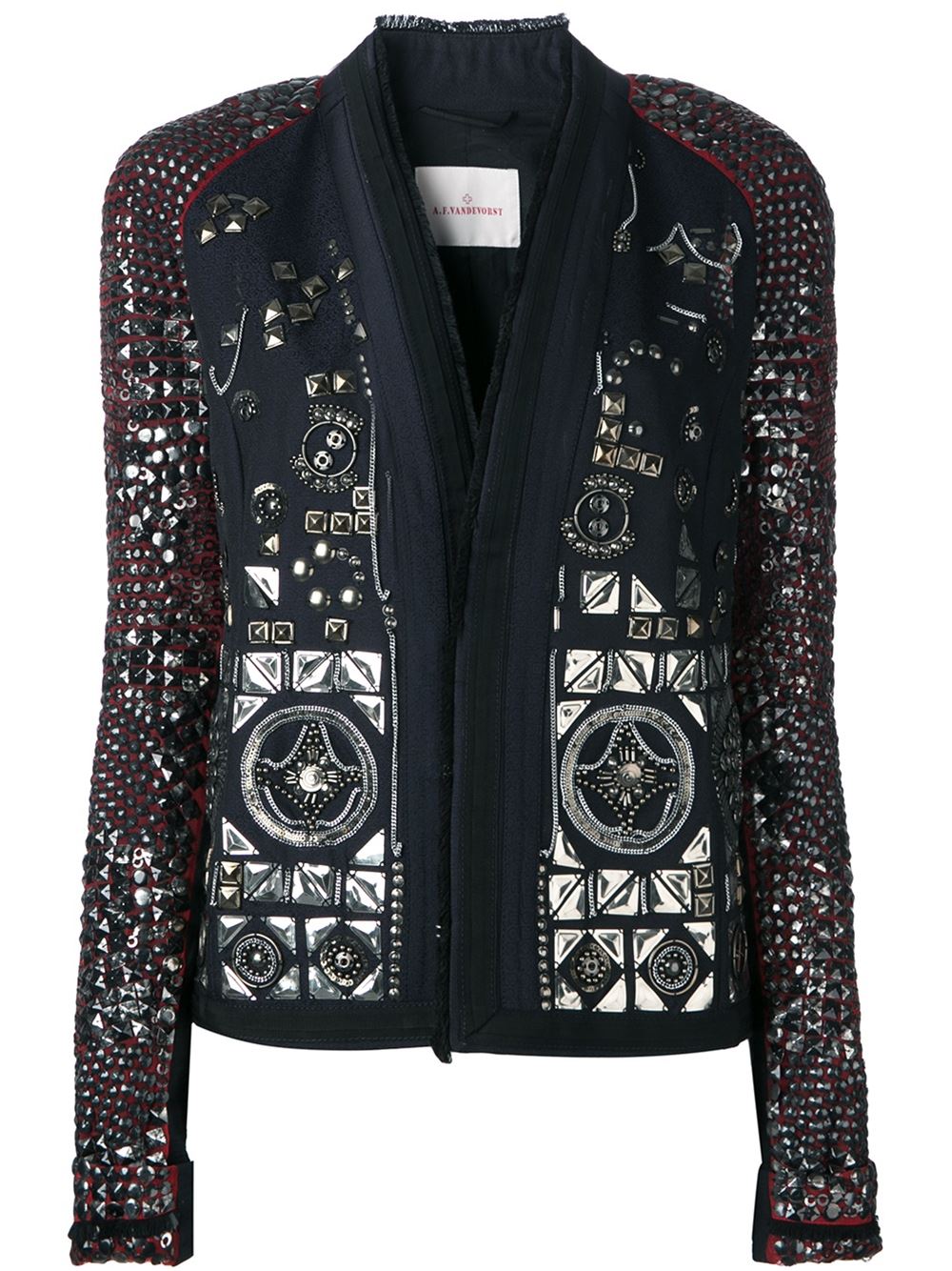 - Black and red wool blend '161 Bohemiane' studded blazer from A.F.Vandevorst featuring a v-neck, a fringed design, silver-tone stud detailing and embroidered details.
