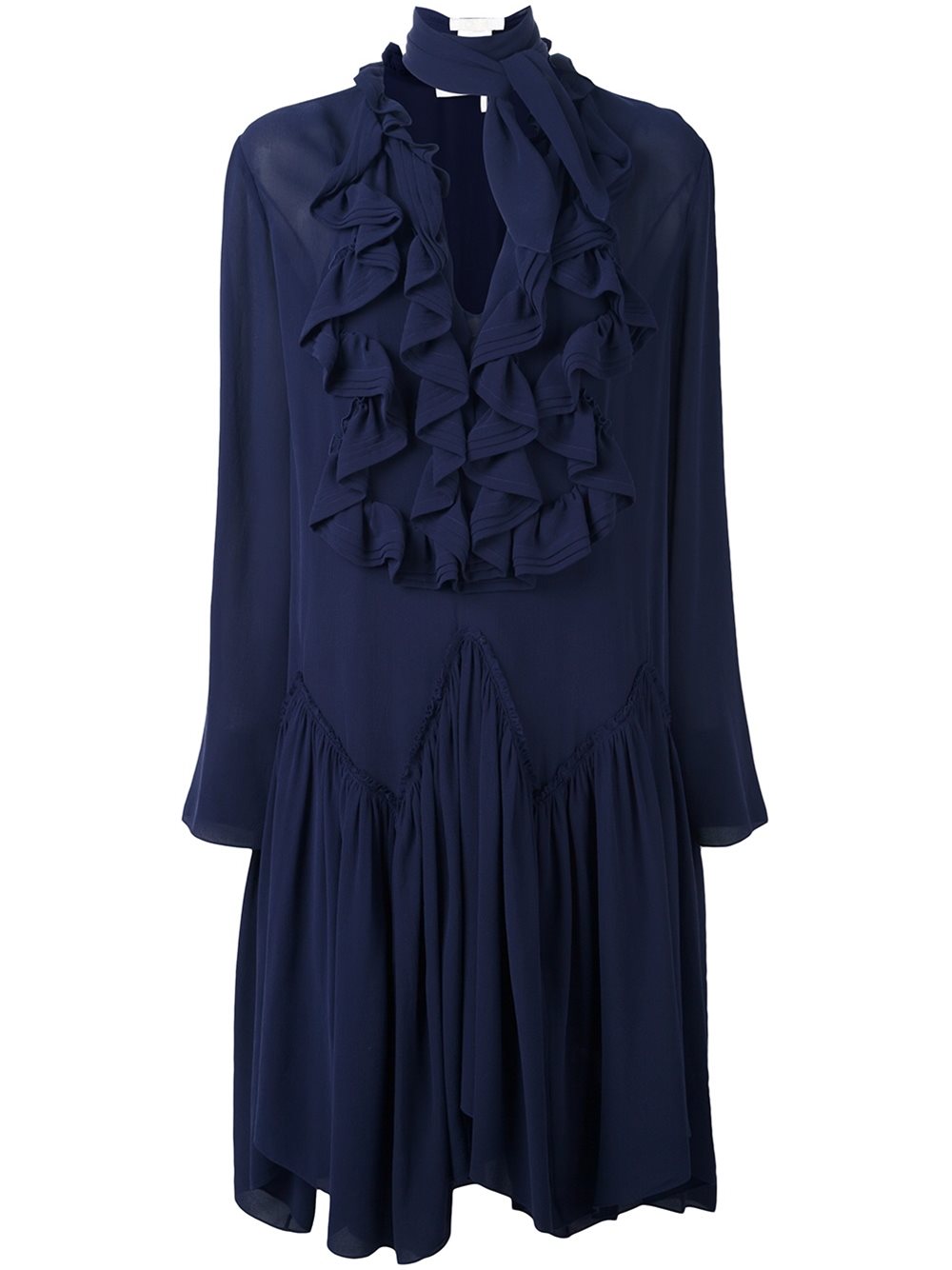 - Ocean blue silk blend ruffled dress from Chloé featuring a deep V neck, a front button fastening, a dropped waist, long sleeves, a pleated skirt, a mid-length, an asymmetric hem and a removable scarf.