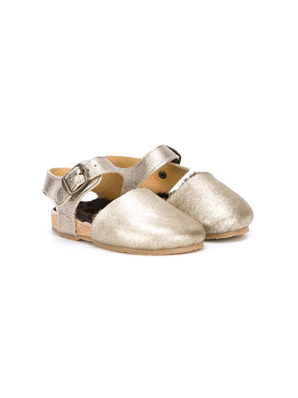 - Pèpè 金色 皮毛一体凉鞋。 圆头, 裸背, 侧扣, 裹踝带, 金属光泽, 橡胶鞋底。