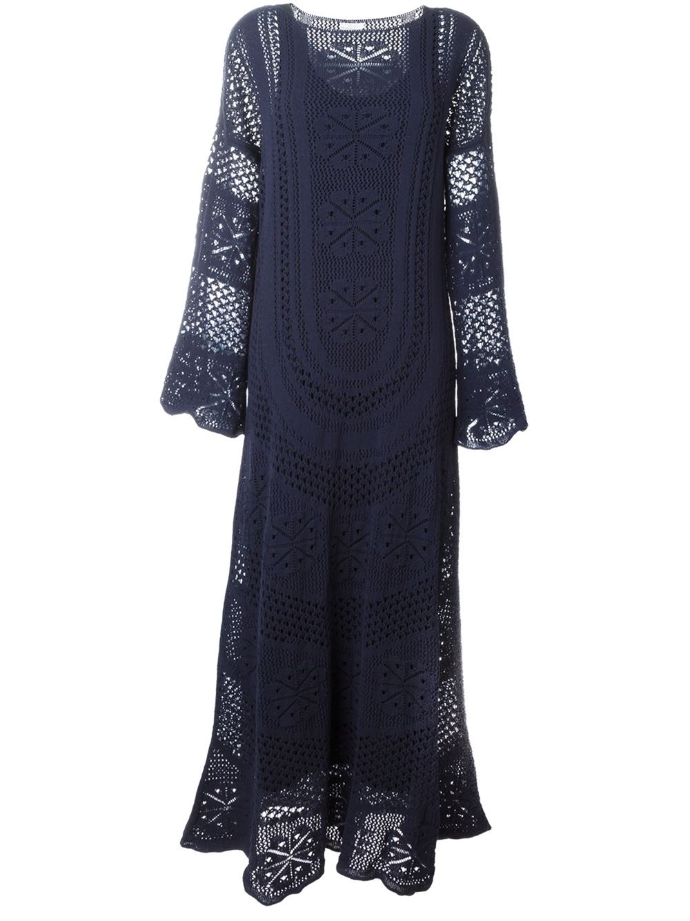 - Chloé 蓝色 丝绸与棉质混纺 钩边针织连衣裙。 一字领, 长袖, 钩编设计, 伞状设计, 长款。