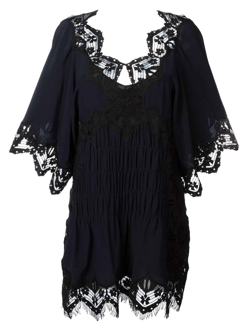 - Chloé 海军蓝色与黑色 丝绸与棉质混纺 蕾丝嵌花连衣裙。 扇贝形领, 短袖, 缩褶式设计, 深V背, 扇贝形下摆, 短款。