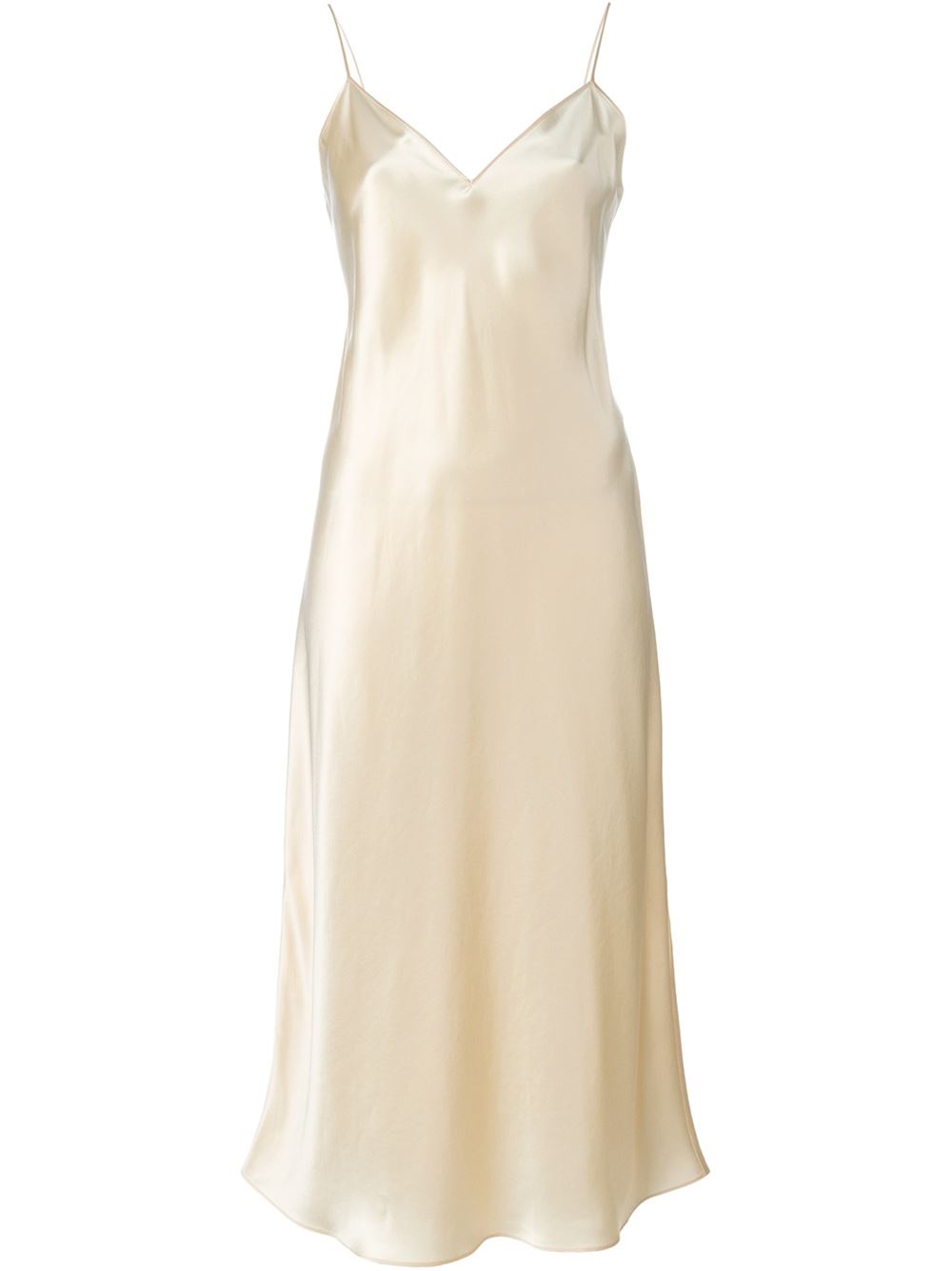 - Saint Laurent 奶油色 丝绸 中长细肩带连衣裙。 V领, 细肩带, 伞状设计, 及小腿的长度。这件商品尺码适中。