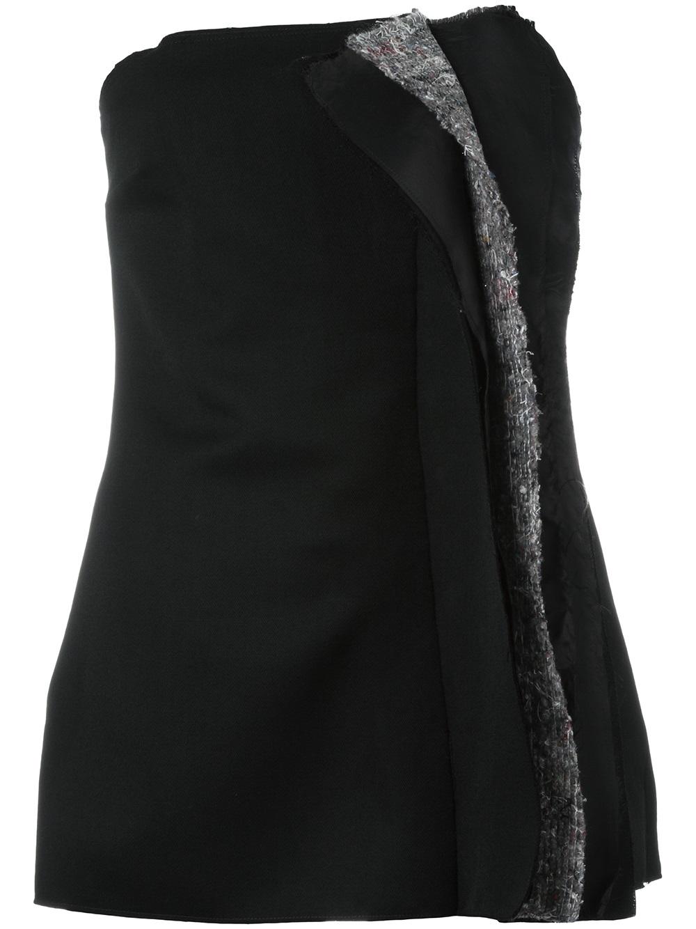 - Black virgin wool blend frayed edge strapless top from Yang Li.
