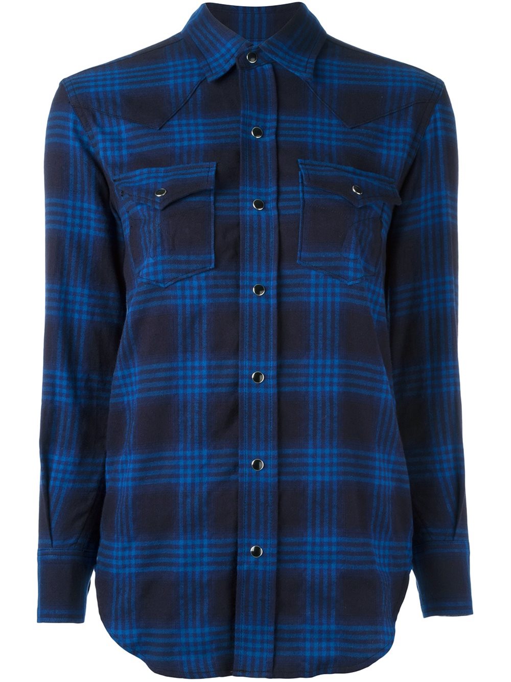 - Saint Laurent (圣罗兰) 蓝色与黑色 棉质混纺 格纹西部牛仔风衬衫。 经典衣领, 摁扣, 两个正面盖袋, 长袖, 摁扣, 格子图案, 曲线形底边。