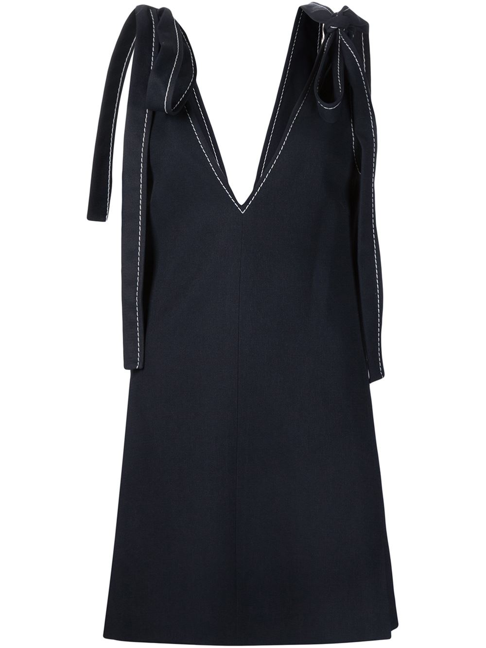 - Chloé 海军蓝色 丝绸混纺 绑带肩连衣裙。 深V领, 深V背, 针脚细节, 侧置口袋, 无袖设计, 短款, 平直下摆。