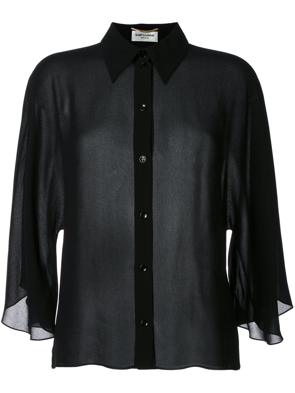 - Saint Laurent (圣罗兰) 黑色 半透视短款衬衫。 经典衣领, 正面纽扣, 七分袖, 平直下摆。