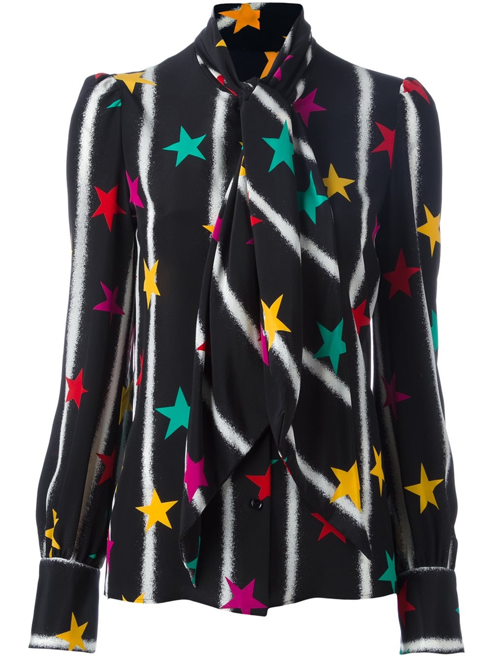 - Saint Laurent (圣罗兰) 黑色与多色 真丝 系带领星星衬衫。 带结衣领, 无领设计, 正面纽扣, 长袖, 搭扣袖口, 平直下摆。