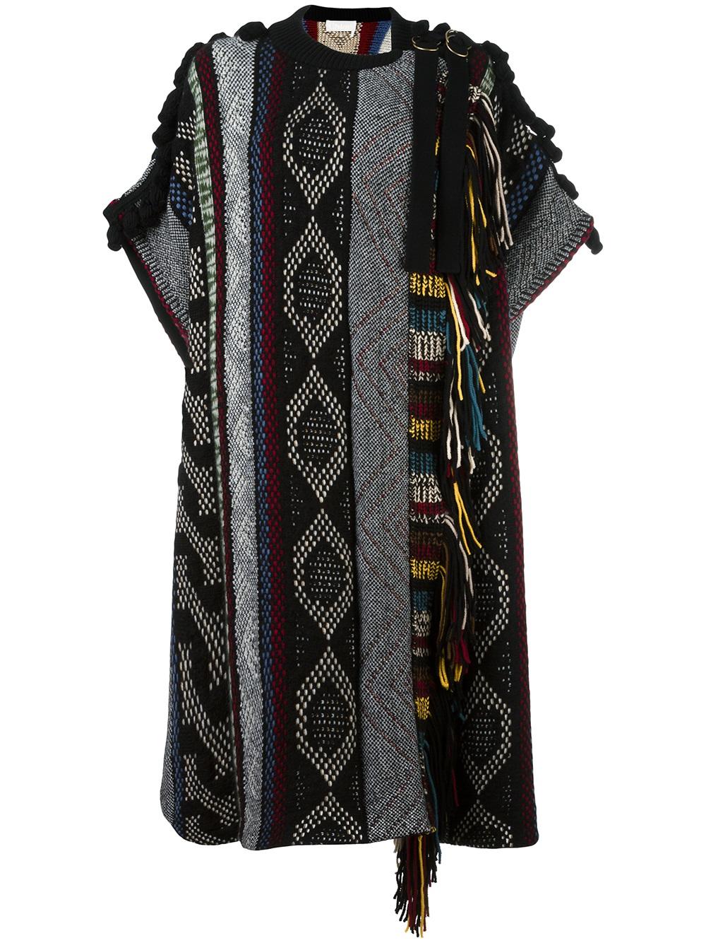 - Chloé (寇依) 多色 羊毛混纺 流苏提花斗篷。 不对称领口, 扣子, 几何花纹, 罗纹边饰, 短袖, 中长, 曲线形底边。