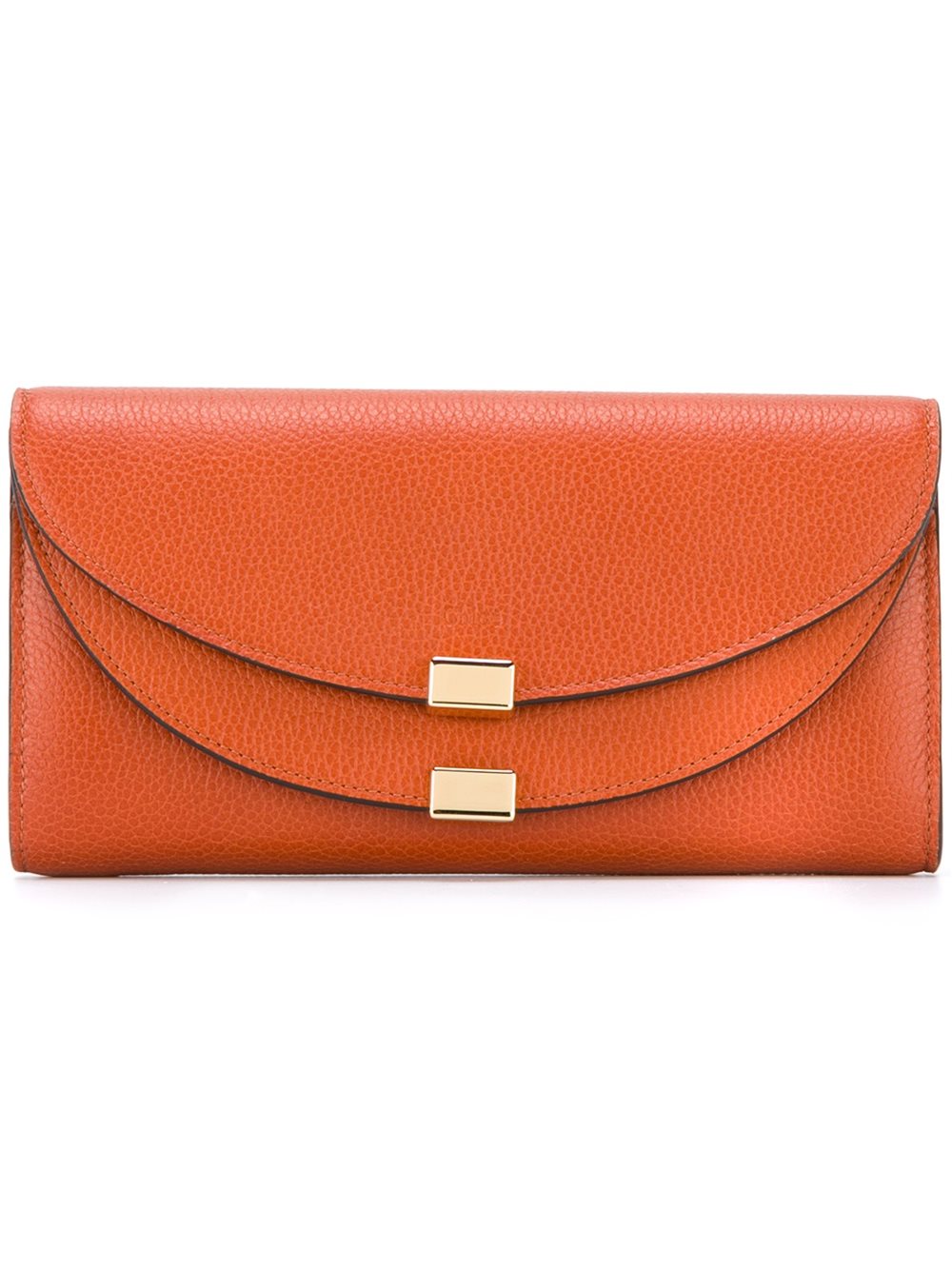 - Chloé (寇依) 橙色 小牛皮 'Georgia'长裤。 金色五金配件, 正面饰有浮雕品牌标记, 翻盖饰有摁扣, 内置多个卡槽, 内置浮雕标记, 内置拉链夹层。
