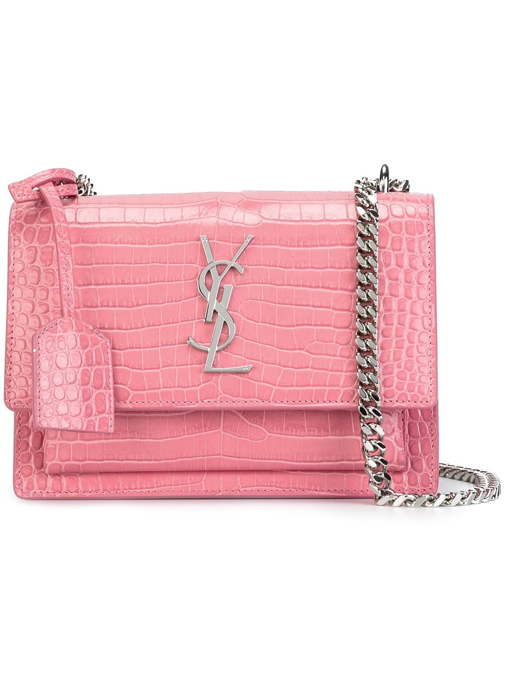 - Saint Laurent (圣罗兰) 粉色 小牛皮 'Sunset Monogram'小号斜挎包。 搭链肩带, 银色五金配件, 正面标志贴, 钥匙吊, 带浮雕及鳄鱼皮效果, 翻盖饰有插入式的摁扣, 内置多个分层。