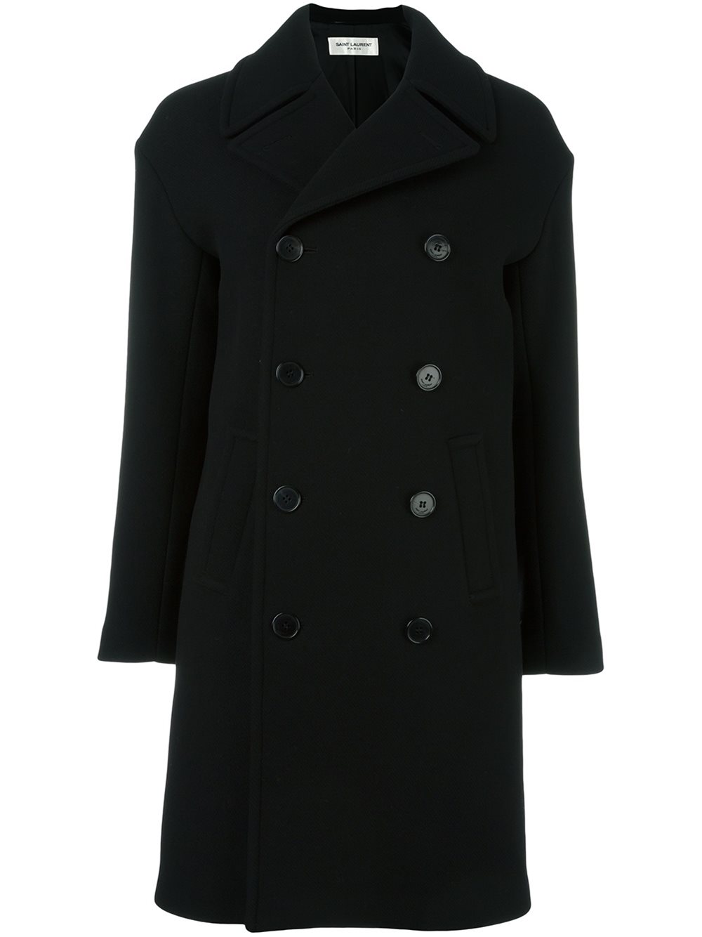 - Saint Laurent (圣罗兰) 黑色 棉质羊绒羊毛 双排扣外套。 经典衣领, 正面有双排扣, 侧身口袋, 垮肩, 长袖, 平直下摆, 全衬里。
