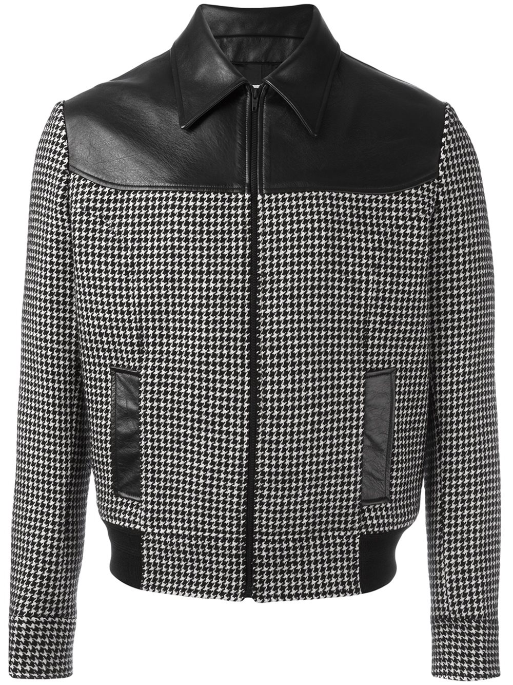 - Black and white cotton, lambskin, silk and wool houndstooth contrast teddy jacket from Saint Laurent featuring a pointed collar, a front zip fastening, two front pockets, long sleeves, button cuffs, a houndstooth pattern, a ribbed hem and a full lining.
