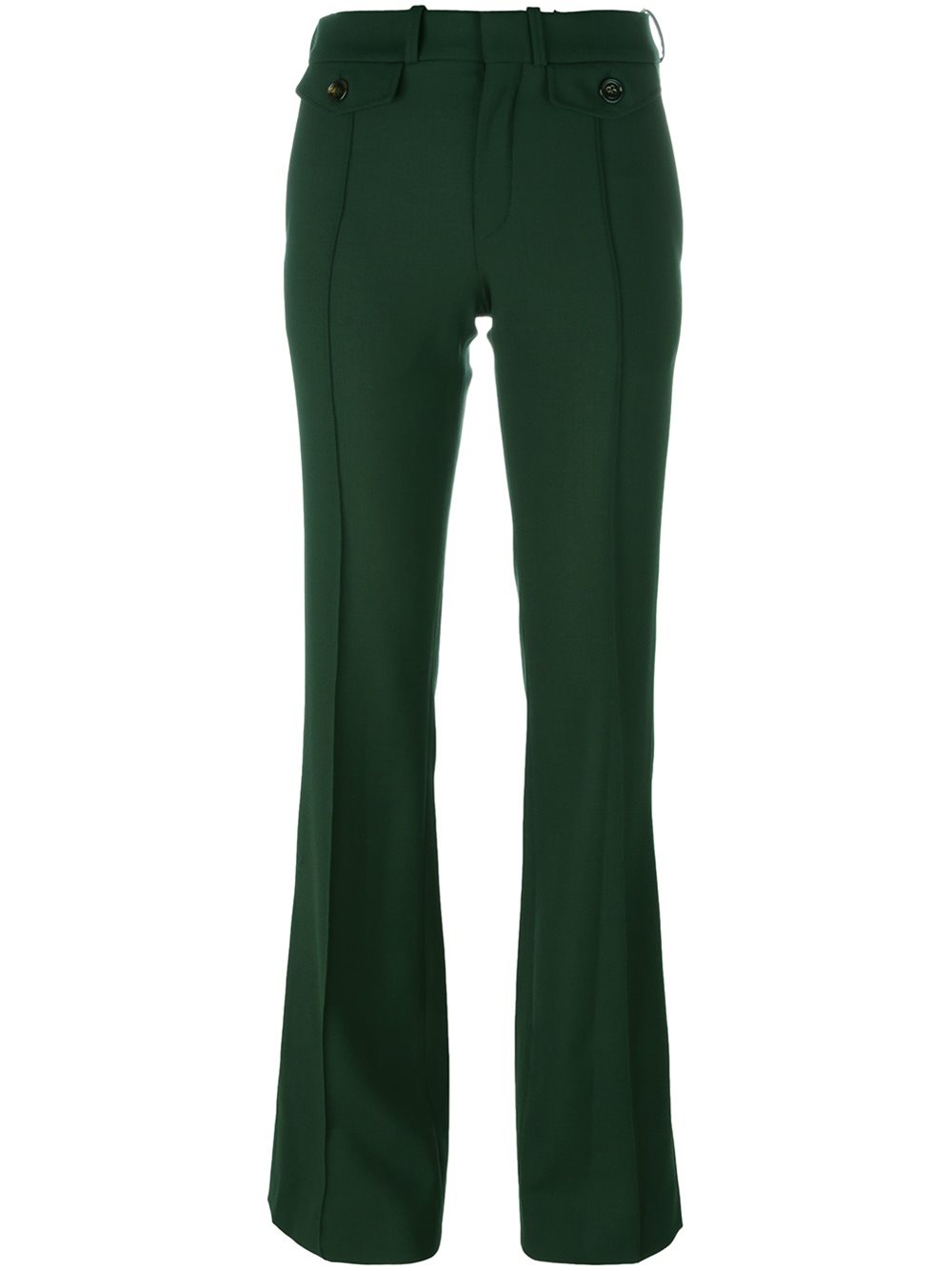 - Forest green stretch virgin wool-silk blend fitted flared trousers from Chloé featuring a concealed front fastening, belt loops, flap and button pockets, a long length, rear welt pockets and raised seams.