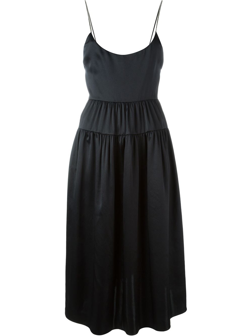 - Saint Laurent 黑色 丝绸 伞摆细肩带连衣裙。 U字形领, 细肩带, 伞状半身裙, 荷叶设计, 平直下摆。