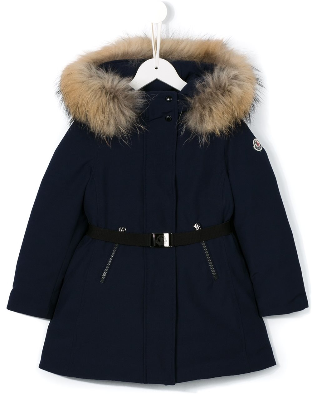 - MONCLER KIDS 深蓝色 棉质混纺与羽绒 束腰带衬垫夹克。 隐藏式正面开合, 正面拉链口袋, 长袖, 左臂饰标志。