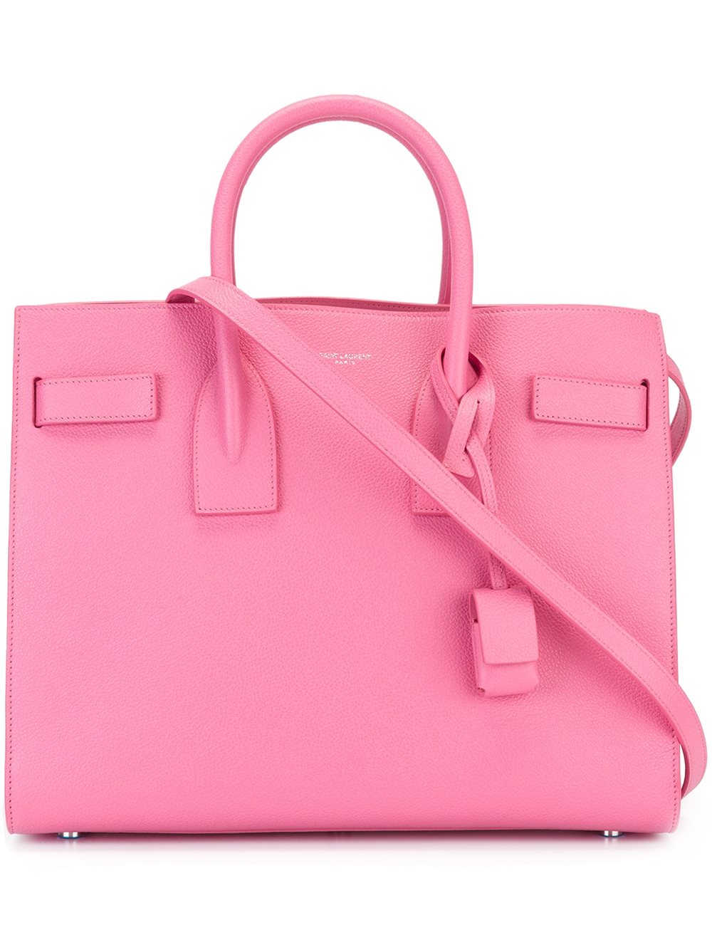 - Pink calf leather small 'Sac de Jour' tote from Saint Laurent featuring round top handles, a front centre logo stamp, a detachable shoulder strap, accordion details at sides, an open top design, an internal logo stamp, an interior zipped compartment, purse feet and a hanging padlock fob.