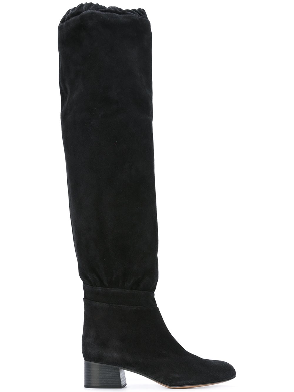 - Chloé (寇依) 黑色 绒面皮与牛皮 'Lena'过膝长靴。 杏仁形鞋尖, 松紧开合, 缩褶细节, 短粗跟。