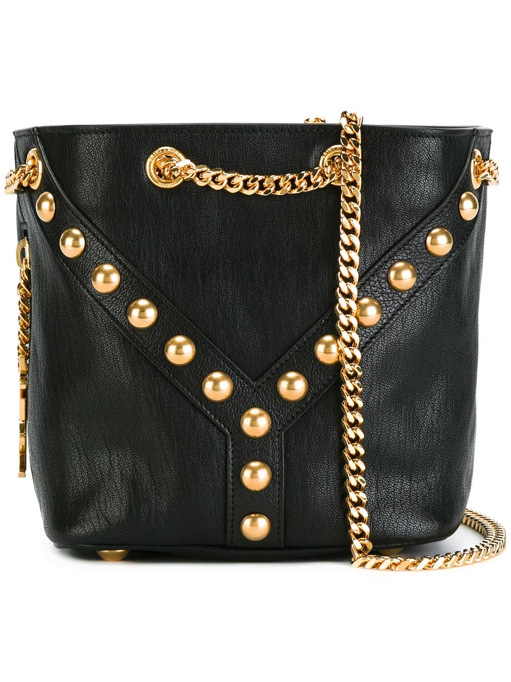 - Black shearling leather baby 'Y Studs' bucket bag from Saint Laurent featuring a chain shoulder strap, a gold-tone stud detailing, a suede lining, an internal logo plaque, an open top design and a hanging monogram logo.