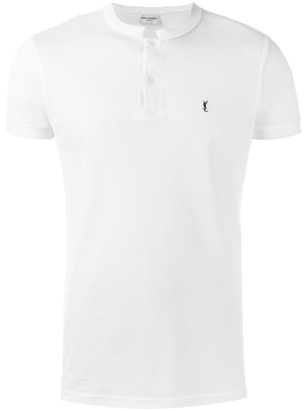 - White cotton band collar polo shirt from Saint Laurent featuring a front button placket, a contrast embroidered logo at the chest, short sleeves, fitted cuffs and a straight hem.