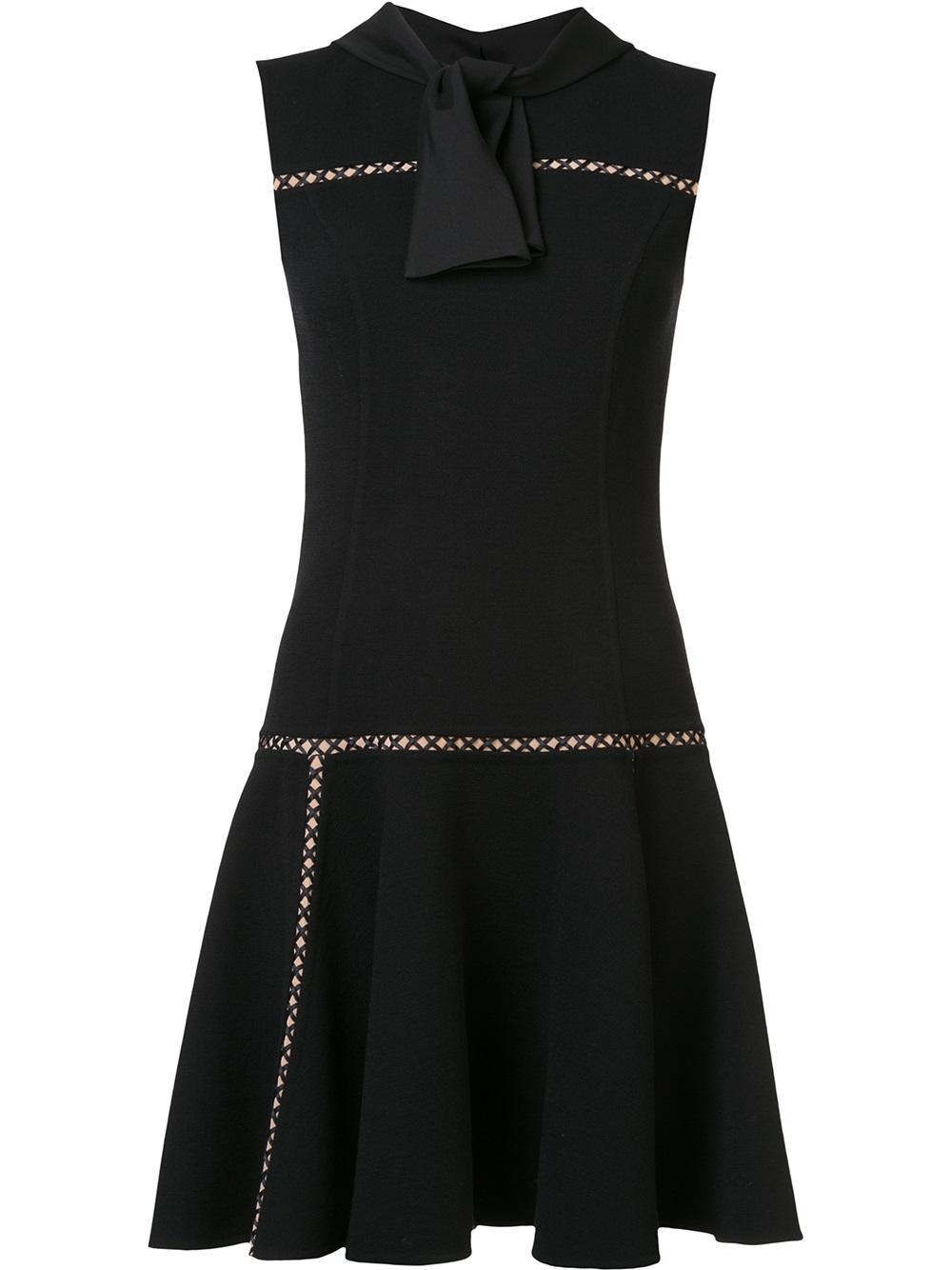 - Carolina Herrera 黑色 羊毛 伞摆无袖连衣裙。 带结衣领, 后置隐形式拉链, 短款, 平直下摆。