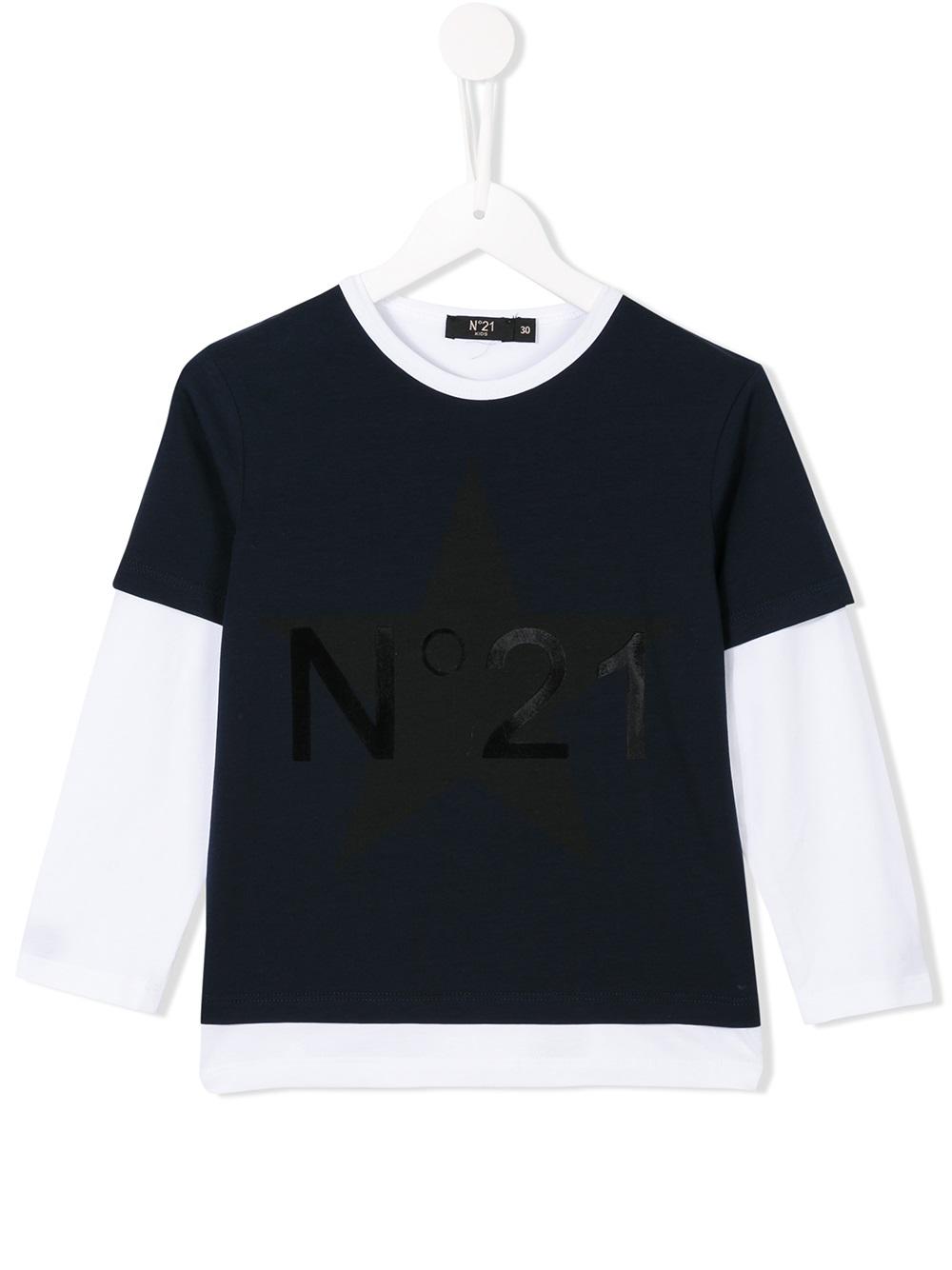 - Navy and white stretch cotton logo long sleeved T-shirt from Nº21 Kids featuring a round neck and a printed logo to the front.
