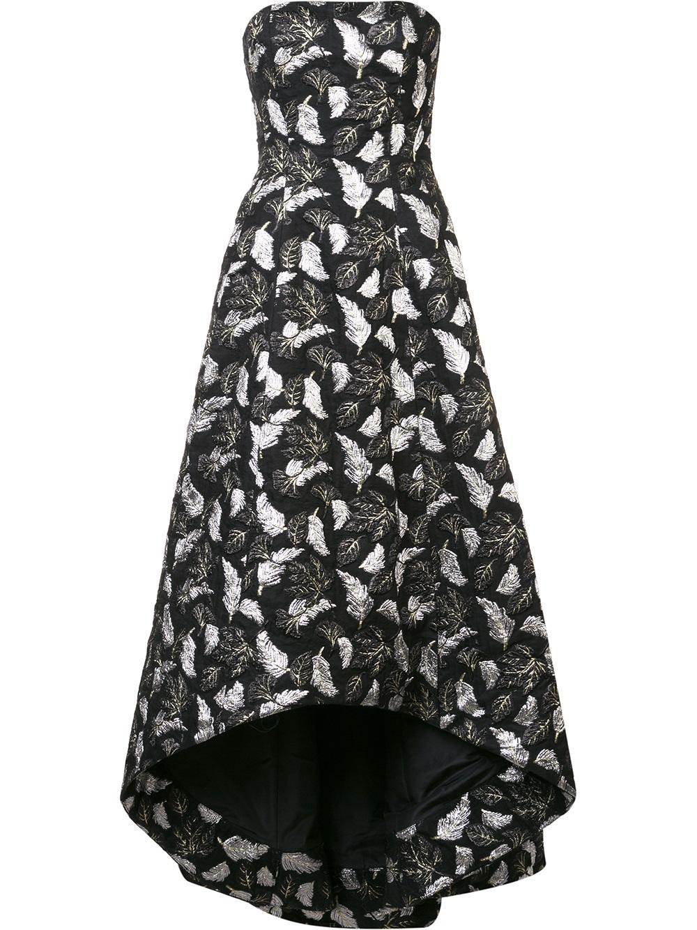 - Black and silver-tone silk blend leaf embroidered gown from Prabal Gurung featuring a strapless design, a fitted waist, a flared skirt, a front inverted pleat, a high low hemline and a back zip fastening.
