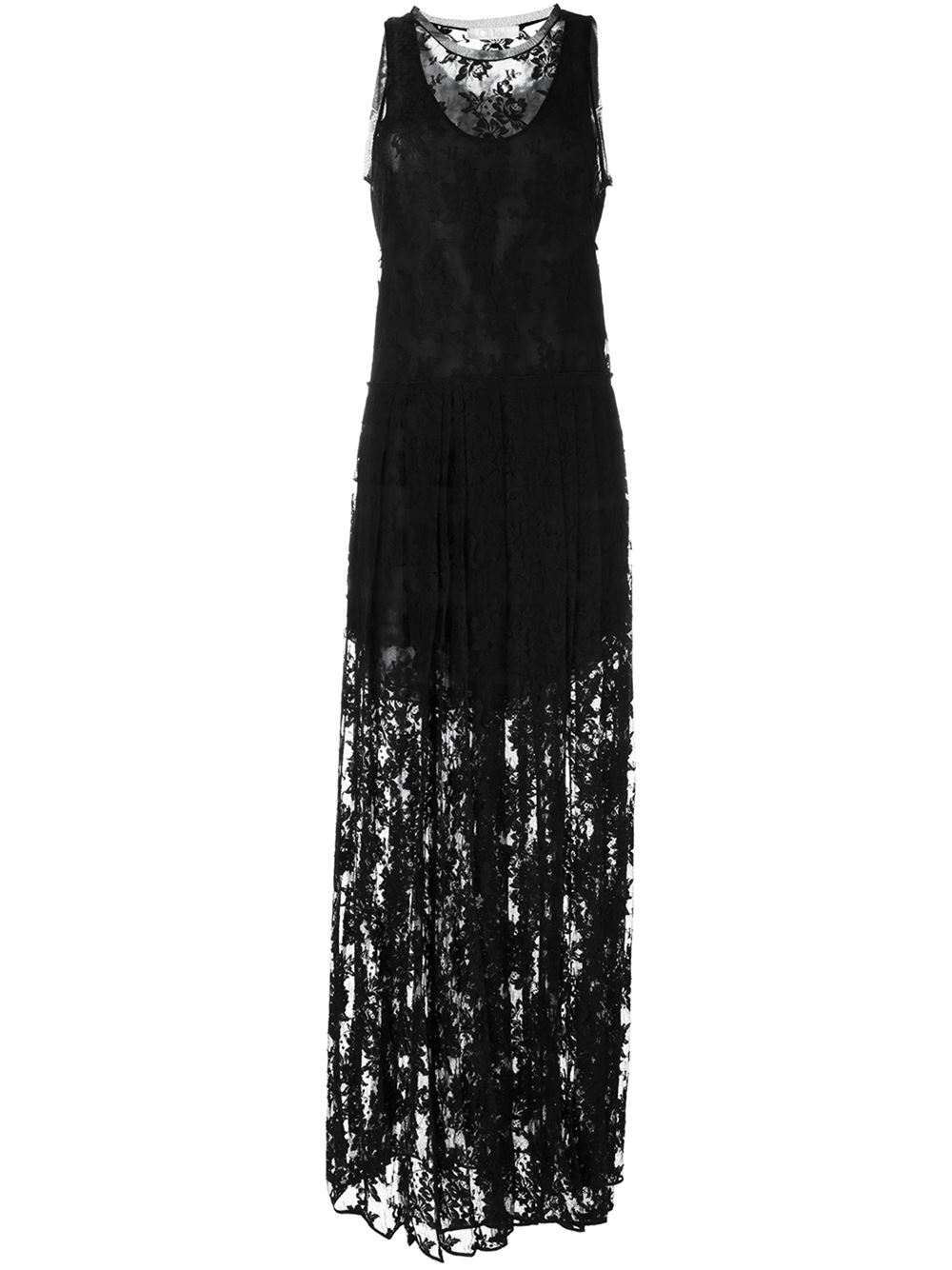 - Chloé 黑色 全棉 无袖蕾丝连衣裙。 圆领, 花卉蕾丝花纹, 半透明设计, 长款。