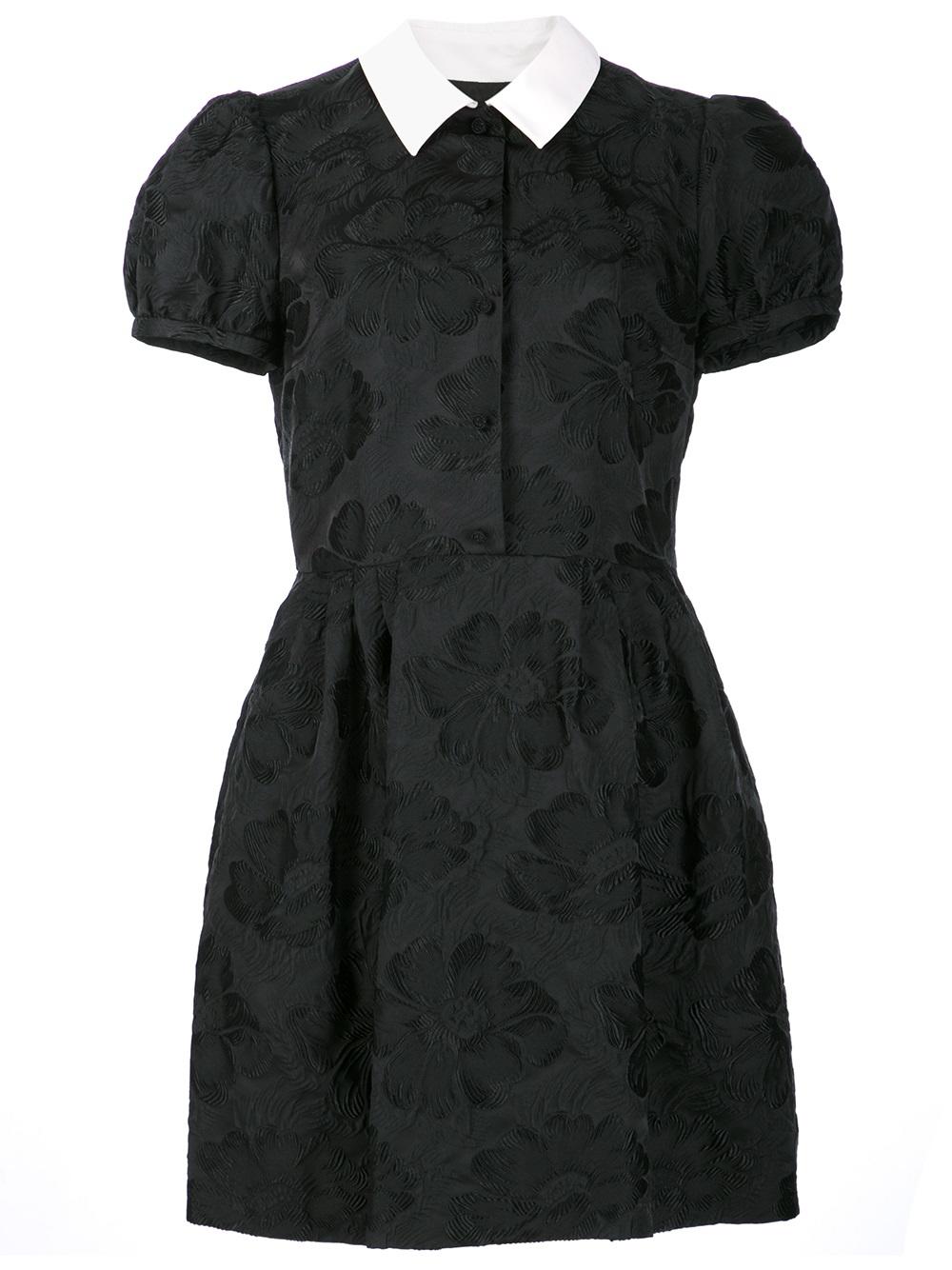 - Black silk floral embossed shirt dress from Saint Laurent featuring a classic collar, a front button fastening, short sleeves, a fitted waist, a pleated skirt and a short length.