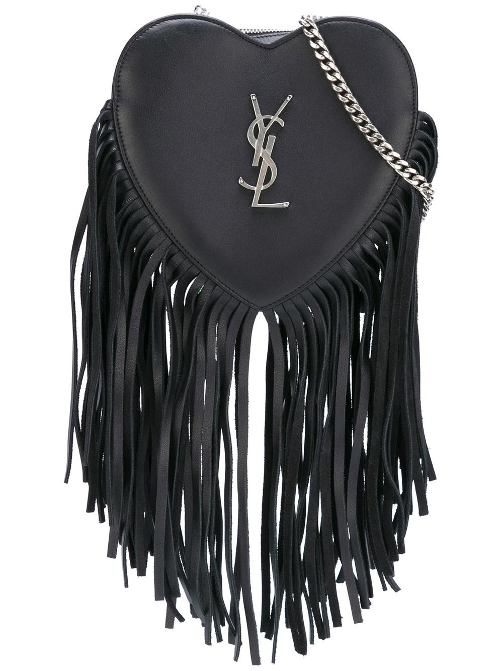 - Saint Laurent (圣罗兰) 黑色 小羊皮 'Love'小号斜挎包。 搭链肩带, 银色五金配件, 正面标志贴, 顶置拉链, 绒面皮衬里, 内置标牌, 流苏边。