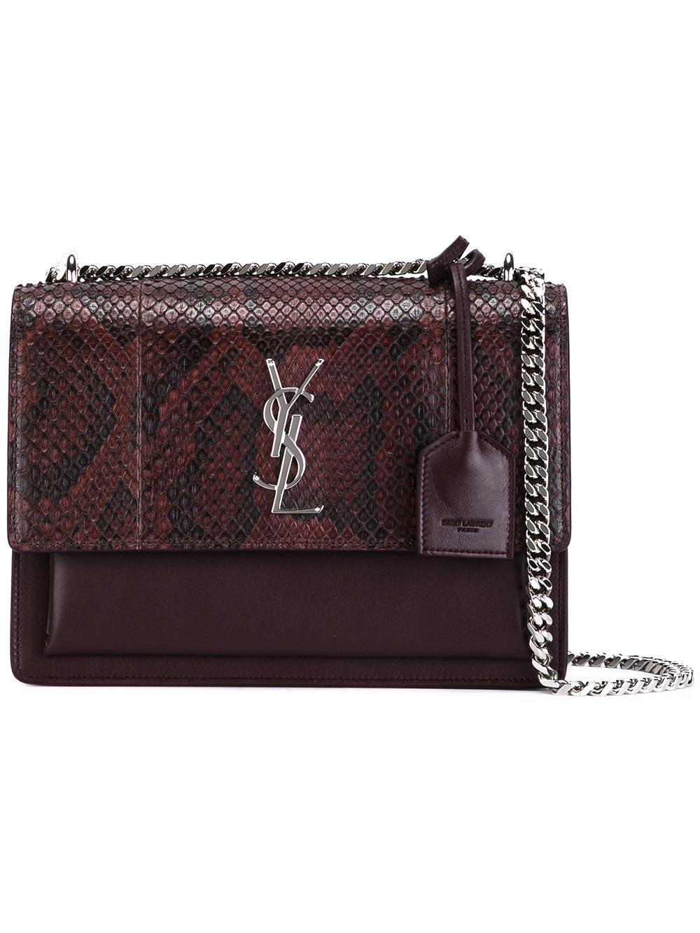 - Red leather medium 'Monogram Sunset' satchel bag from Saint Laurent featuring a chain shoulder strap, a front logo plaque, silver-tone hardware, a foldover top with magnetic closure, a snakeskin effect, a suede lining, an internal slip pocket and an internal logo plaque.