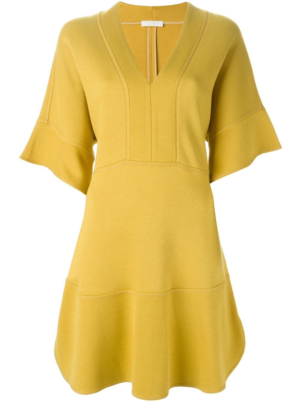- Chloé 黄色 V领连衣裙。 阔短袖, 短款, 合身廓形。