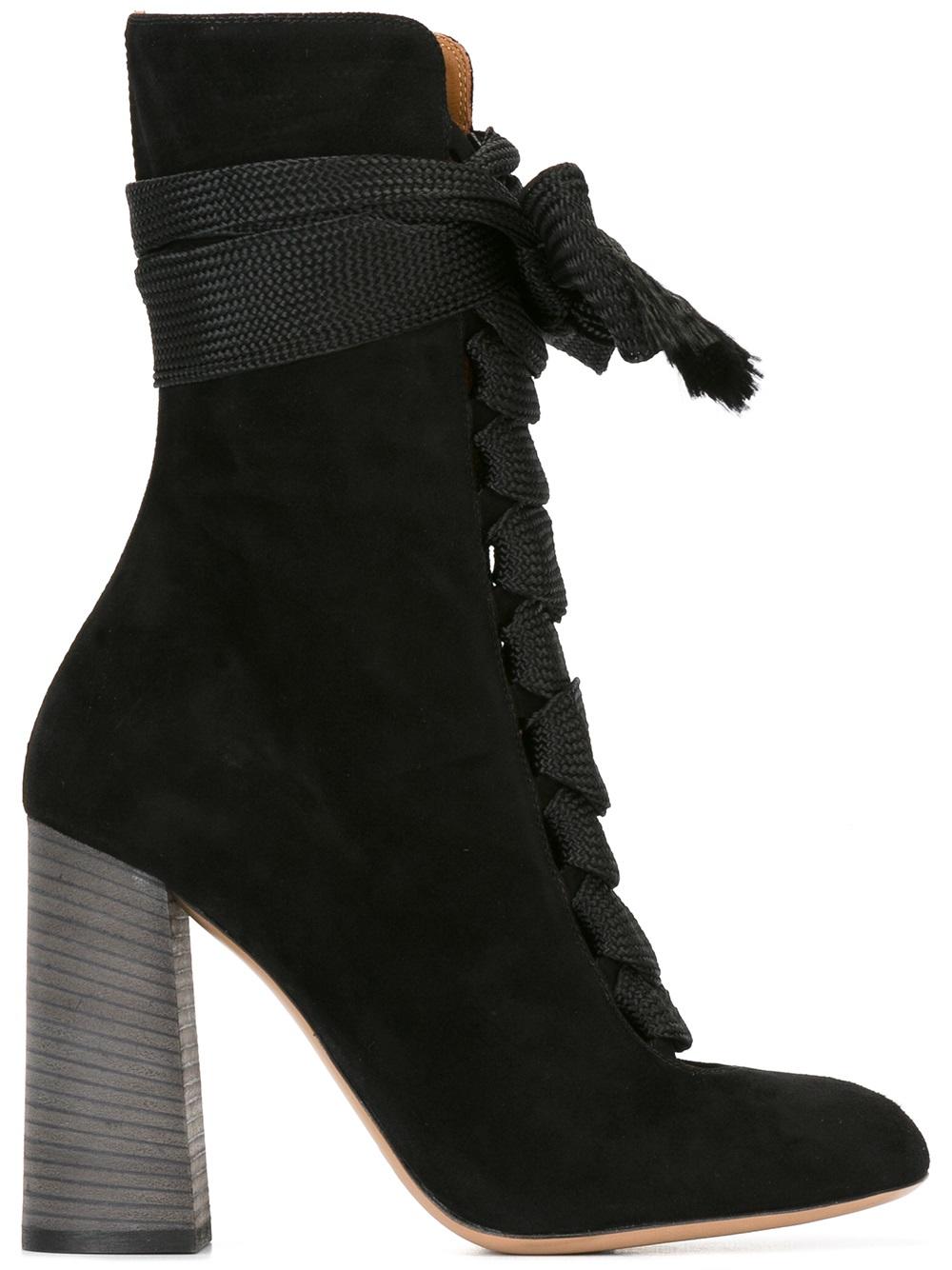 - Chloé (寇依) 黑色 牛皮与小牛皮 'Harper'中长款高跟靴。 杏仁形鞋尖, 正面绑带, 侧置拉链。