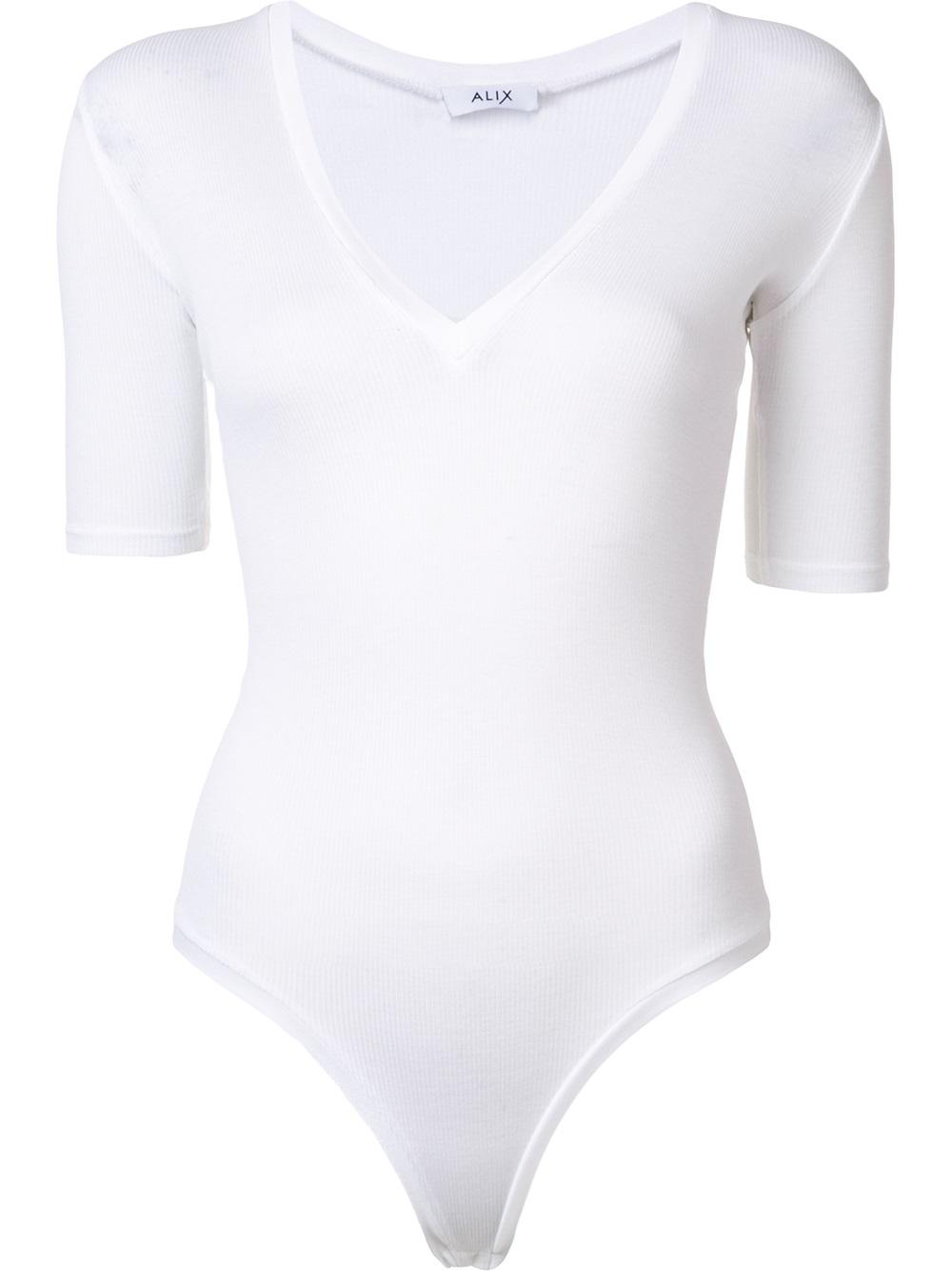 - White v neck bodysuit from Alix. Underwear and lingerie must be tried on over your own garments.