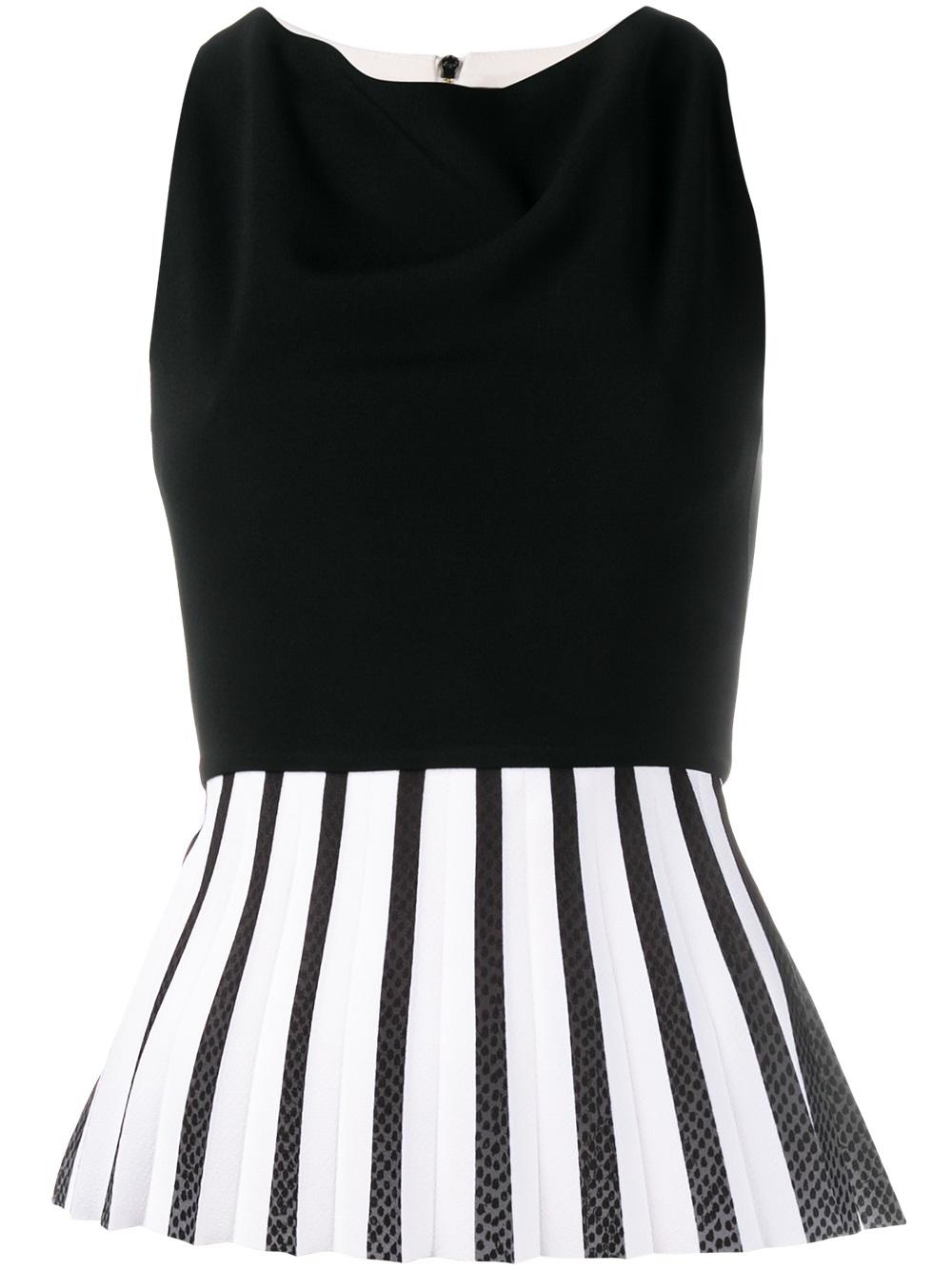 - Roland Mouret 黑色与白色 弹性丝绸 褶饰收腰伞摆上衣。 圆领, 无袖设计, 束腰, 后置拉链。