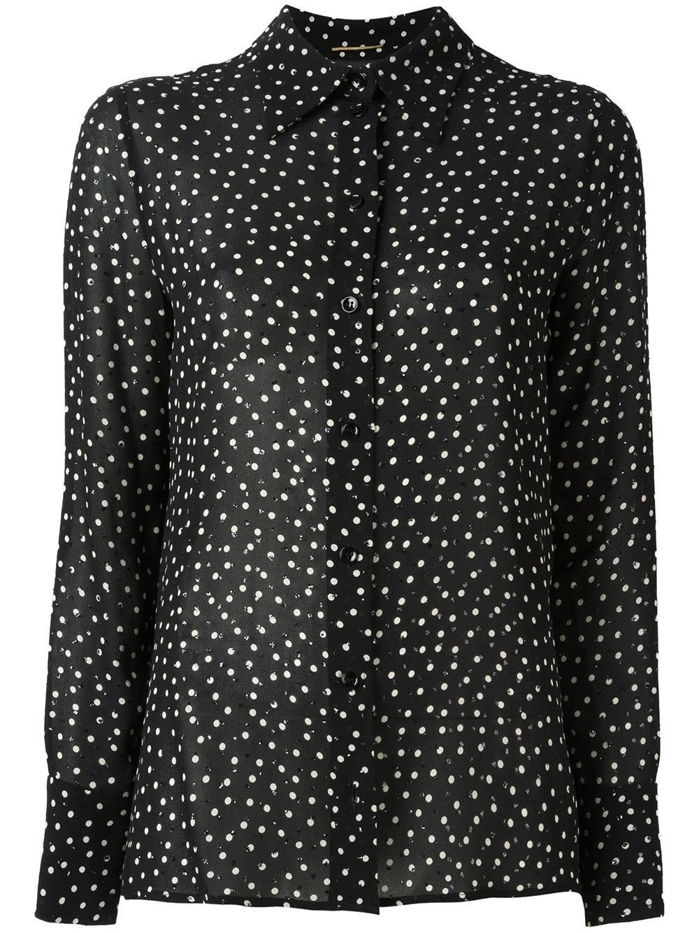 - Saint Laurent (圣罗兰) 黑色与白色 亮片镶嵌印花衬衫。 经典衣领, 正面纽扣, 圆点印花, 亮片刺绣, 长袖, 搭扣袖口, 平直下摆, 半透明设计。